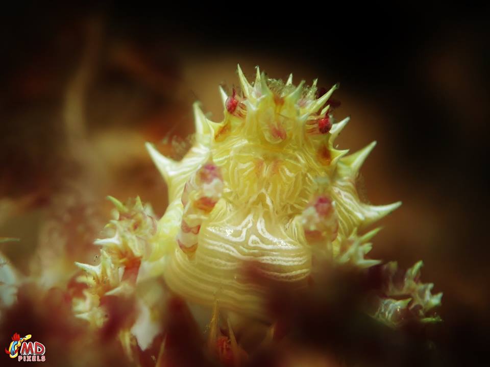 Candy Crab, Hoplophrys oatesi Moalboal, Philippines Canon S120 with Ikelite Housing Sea & Sea YS-03 Strobe Saga +10 Achromatic Lens f/5.7 | 1/60 sec | ISO 80 photo by Melvyn D’Couto