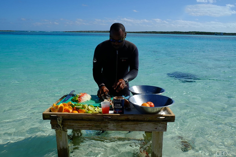 其次是当地的饮食。巴哈马的食物都是以海鲜为特色的,我很喜欢当地的一道海螺沙拉,就是就海螺片加上切碎的番茄、洋葱等蔬菜做成的沙拉,有的还会加上一些热带水果。制作沙拉的人就站在清澈到可以看到小鱼的海水中,在海滨的阳光下给我们演示制作沙拉的过程。沙拉里虽然放了盐给海螺去腥,但吃到嘴里的味道是甜的,配上美丽的阳光和碧蓝的海面,简直是味觉和视觉的双重享受。