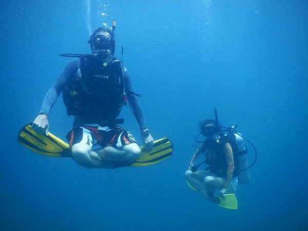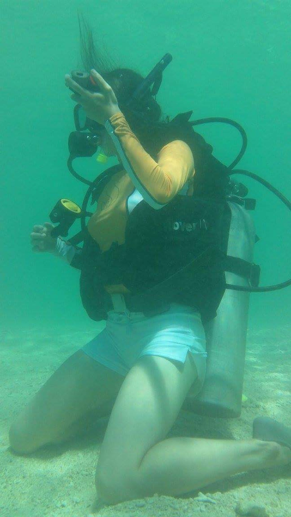 潜水时也会有操作考试,也就是按照教练的要求完成不同的操作。必须完全完成才能毕业,但是其实不是很难,只要女生不要太娇气就行。放一张我最满意的操作考试照,如图所示,需要悬浮在水下20米处不触碰海底不到挂直到2分钟。